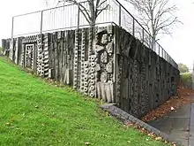 The work comprises three 3-metre (9.8 ft) high panels cast in pigmented concrete in deep relief, incorporating motifs including "sunbursts, donuts, triangular wedges and shards" and Aztec-like symbols.[2][1] Mitchell said "that the treatment of the external face of the underpass provided climbing opportunities for the adventurous",[1] and a group of student rock-climbers have plotted bouldering routes on the murals.[2]