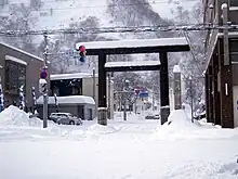 Hokumon Jinja (北門神社) is a Shinto shrine in Wakkanai, Hokkaidō, Japan. In Tenmei 5 (1785), Matsumae Domain trader and agent Murayama Denbee (村山伝兵衛) (1738–1813) is said to have founded the small shrine of Sōya Daijingū (宗谷大神宮), enshrining Amaterasu as guardian of the north gate.[1][2] In 1896 the shrine was transferred to its current location and renamed Hokumon Jinja, with Takemikazuchi and Kotoshironushi enshrined alongside Amaterasu. In 1902 work on the shrine buildings was completed, but on 17 May 1911 the whole complex was destroyed by a wild fire. The year 1913 saw the rebuilding of the honden and haiden and in 1916 Hokuman Jinja was ranked as a Village Shrine. In 1925 the shrine offices were donated and in 1933 Hokumon Jinja was promoted to the rank of District Shrine. The hexagonal shrine mikoshi was dedicated in 1949 and in 1978 the new shrine building was completed and a transfer ceremony held.[1]