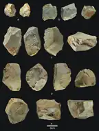 Although 41% of the section's assemblage consists of flakes, they are rather crude and large—averaging 38 mm × 30 mm × 11 mm (1.50 in × 1.18 in × 0.43 in)—either resulting from rudimentary knapping (stoneworking) skills or difficulty working such poor quality materials. They made use of the unipolar longitudinal method, flaking off only one side of a core, probably to compensate for the lack of preplanning, opting to knap irregularly shaped and thus poorer quality pebbles.[19]