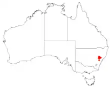 This species has a restricted distribution and is endemic to the north-western section of Wollemi National Park in central New South Wales. It occurs on Narrabeen sandstone, shallow sandy soils in layered woodland or heath, usually on steep rocky terrain in dry open forests.[3][4]