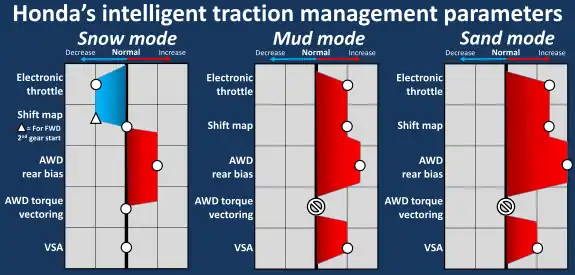 - Intelligent traction management—which offers different drive modes normal and snow for front-wheel drive (FWD) and adds mud and sand for all-wheel drive (AWD) that adjusts throttle mapping, shift points, power distribution, and Vehicle Stability Assist (VSA) responses—(all models):