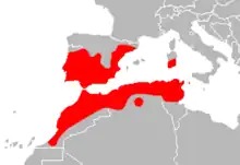 H. hippocrepis is found in Algeria, Morocco and Tunisia in North Africa, and in southern and central Portugal, southern, eastern and central Spain, Gibraltar, southern Sardinia and Pantelleria Island in Europe. In the island locations, it may have been introduced.[1] Since the early 2000s it has been reported from Balearic Islands of Mallorca, Ibiza and Formentera. It could have been introduced there by way of old olive trees imported from mainland Spain. The species is thriving there and becomes larger than on the mainland.[5][6][7][8]