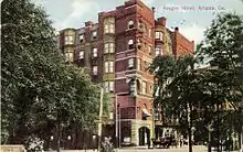 Following the war, Atlanta rebounded and began to rebuild at a rapid pace. New hotels arose to replace those lost during the war, including the Kimball House (1870) and the Markham House (1875). While many of the hotels before and after the war were built around State Square in downtown Atlanta, by the 1890s many of the newer hotels were being built north of the area along "upper Peachtree". Some of these notable buildings included the Majestic Hotel (1898) and the Piedmont Hotel (1903).[6][7] Also starting around this time, several hotels opened on Hotel Row near the newly opened Terminal Station in South Downtown. Among these was the Terminal Hotel, built in 1906 by prominent Atlanta businessman Samuel M. Inman.[8] However, stiff competition from other hotels in downtown caused the area to experience a decline a few decades later.[9]