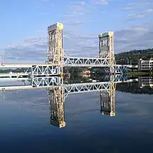 The Portage Lift Bridge connects Hancock and Houghton, Michigan, by crossing over Portage Lake, which is part of the river and canal system that crosses the entire peninsula. The Portage Lift Bridge is the world's heaviest and widest double-decked vertical lift bridge. Its center span "lifts" to provide 100 feet (30 m) of clearance for ships. Since rail traffic was discontinued in the Keweenaw, the lower deck is used to accommodate snowmobile traffic in the winter. This is the only land based link between the north and south section of the Keweenaw peninsula, and is crucial.[24]