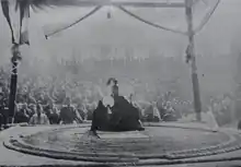 Since the fall of the Tokugawa shogunate and the establishment of the Meiji Restoration, the Gojō family of Kyoto began to thrive, taking advantage of the decline of the powerful Yoshida patrons, the Hosokawa clan.[8] They began to produce an incomprehensible abundance of yokozuna.[9] In 1877, the 23rd Yoshida Oikaze served again in the Satsuma Rebellion but was defeated and captured. With its leader in prison, the House of Yoshida was unable to oppose the appointment that same year of Yokozuna Sakaigawa, nominated by the Gojō family, and had to approve this choice.[8] Sakaigawa was promoted yokozuna during this period of turmoil, and he was the only yokozuna to be officially recognized at the end of that period of "overproduced yokozuna", also known as the "yokozuna abuse era" (横綱濫造時代).[9] In 1884, however, Umegatani I received a double license from the Yoshida and Gojō families at his request, resulting in the Yoshida family's survival.[8] The 23rd Oikaze of the Yoshida family continued to award official licences to yokozuna until the 35th, Futabayama, in 1937.[10]