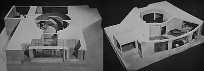 Buhs House was an extremely innovative home for its day in 1936, called in Architectural Record magazine "an outstanding example of modern architecture. The 'Made in Detroit' Home was built and equipped with materials made in Detroit and sponsored by the Detroit Board of Commerce."[53] Keyes followed much of the International Style of Swiss architect Le Corbusier, and even anticipated the stripped-down Functionalism exemplified in the 1930s in Sweden in Södra Ängby. In Buhs House, Keyes first experimented with a large, clean white brick façade and strict functionalistic themes of cubic volumes, flat-rolled sheet roofs, large windows, and rounded walls and balconies (Le Corbusier's "ocean liner" aesthetic) that he would gradually morph into his own Regency Moderne style.[3] Keyes designed the home for Lloyd H. Buhs.[54] (The Buhs's daughter, Martha Henry, became a notable American-Canadian actress. Lloyd Buhs, the secretary-treasurer of the Pfeiffer Brewing Company, was charged in 1943 with embezzling company funds to purchase a controlling interest in a small war plant.[55])