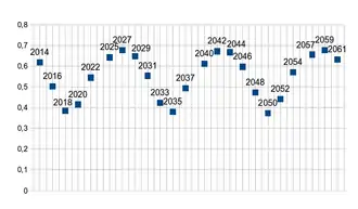 The energy needed for transfer between planetary orbits, or delta-v, is lowest at intervals fixed by the synodic period. For Earth–Mars trips, the period is every 26 months (2 years, 2 months), so missions are typically planned to coincide with one of these launch periods. Due to the eccentricity of Mars's orbit, the energy needed in the low-energy periods varies on roughly a 15-year cycle[4] with the easiest periods needing only half the energy of the peaks.[5] In the 20th century, a minimum existed in the 1969 and 1971 launch periods and another low in 1986 and 1988, then the cycle repeated.[4] The next low-energy launch period occurs in 2033.[6]