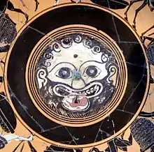 Humbaba was commonly depicted in Mesopotamian art in the Old Babylonian period.[6] However, often only his face was shown.[15] Such depictions had an apotropaic purpose.[122] An example has been identified as a decoration of the gate of an Old Babylonian temple excavated in Tell al-Rimah.[123] Ornamental heads of Humbaba are also mentioned in multiple administrative texts from Mari[2] and in a list of jewelry from Qatna.[1] Multiple works of art showing the confrontation between Humbaba and Gilgamesh and Enkidu are also known, including clay plaques and cylinder seals from various locations in Mesopotamia and neighboring areas, and possibly a statue from the Louvre collection showing a hero standing on the head resembling these identified as depictions of Humbaba.[158] While it can be assumed that depictions from Nuzi or from various Mitanni sites strictly reflect the Mesopotamian tradition, it is not certain if artists in western Iran or in Anatolia were necessarily using the motif in its original context, and might have instead reinterpreted it as a representation of unidentified local myths instead.[159]