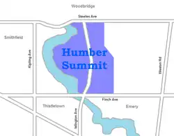 Humber Summit is a neighbourhood in Toronto, Ontario, Canada. It is one of the northernmost neighbourhoods in Toronto, located in the North York district of the city. It is bounded by Steeles Avenue to the north, Highway 400 to the east, Finch Avenue to the south, and follows the Humber River (east branch) to the west.