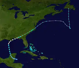 A tropical disturbance moved northward, crossing Guatemala from the eastern Pacific Ocean into the northwest Caribbean Sea between September 20 and September 21. It became a tropical cyclone soon after emerging into the Caribbean, and moved across the Yucatán Peninsula as a tropical depression before becoming a tropical storm in the Gulf of Mexico on September 22 and a hurricane on September 23. It turned sharply east-northeast across the Mouth of the Mississippi river on September 24 as a minor hurricane.[4] The storm continued east-northeast and made landfall in Florida east of Pensacola. The system evolved into an extratropical cyclone soon after passing out of the Sunshine State and continued moving east to northeast hugging the Atlantic Seaboard to near the Virginia Capes before moving slowly through the shipping lanes between Canada and Bermuda, blocked by a high pressure system in southeast Canada.[5]