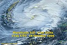 Hurricane Lili was a relatively long-lived hurricane of the 1996 Atlantic hurricane season that affected countries from Central America to the United Kingdom. Lili formed on October 14 from a tropical wave, which emerged from the coast of west Africa on October 4. After the storm formed, further strengthening of Lili was gradual, first to tropical storm status on October 16 and then to hurricane status on October 17. The next day, Lili struck Cuba and moved across the central portion of the island, the first hurricane to hit the country since Hurricane Kate in 1985. After emerging into the Atlantic Ocean, the hurricane accelerated northeastward, briefly peaking as a category 3 hurricane on the Saffir-Simpson Hurricane Scale near the Bahamas. For almost an entire week, Hurricane Lili oscillated in intensity while fluctuating several times in forward speed. About two weeks passed before Lili transitioned into an extratropical storm north of the Azores on October 27, which subsequently moved across Ireland and Great Britain.