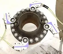 Four narrow-clearance hydraulic torque wrenches on a flange.