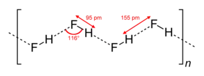 HF is diatomic in the gas-phase. As a liquid, HF forms relatively strong hydrogen bonds, hence its relatively high boiling point. Solid HF consists of zig-zag chains of HF molecules. The HF molecules, with a short covalent H–F bond of 95 pm length, are linked to neighboring molecules by intermolecular H–F distances of 155 pm.[4] Liquid HF also consists of chains of HF molecules, but the chains are shorter, consisting on average of only five or six molecules.[5]