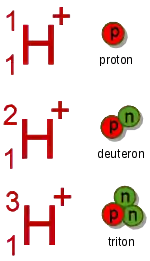 . The general term "hydron", endorsed by the IUPAC, encompasses cations of hydrogen regardless of their isotopic composition: thus it refers collectively to protons (1H+) for the protium isotope, deuterons (2H+ or D+) for the deuterium isotope, and tritons (3H+ or T+) for the tritium isotope.