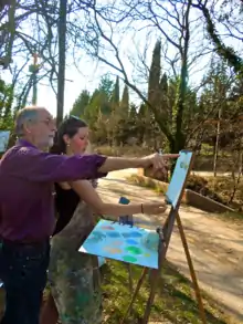 Former Professor and Assistant Dean John Gasparach assisting a student with her landscape painting.