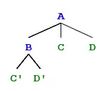 The node labelled A immediately dominates the nodes B, C, and D, and the node labelled B immediately dominates C' and D'. A also dominates C' and D', but not immediately