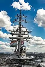 INS Tarangini is a three-masted barque, commissioned in 1997 as a sail training ship for the Indian Navy. She is square rigged on the fore and main masts and fore-and-aft rigged on the mizzen mast. She was constructed in Goa to a design by the British naval architect Colin Mudie, and launched on 1 December 1995. In 2003–04, she became the first Indian naval ship to circumnavigate the globe.