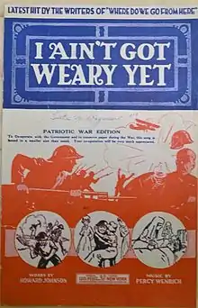 "I Ain't Got Weary Yet!" is a World War I song written by Howard Johnson and composed by Percy Wenrich.[1] It was published in 1918 by Leo Feist Inc., in New York City. The sheet music cover depicts Americans overtaking Germans while a plane flies overhead. Three vignettes depict soldiers digging, a soldier holding his bride, and a nurse tending to a wounded soldier.[2]