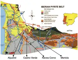 The Iberian Pyrite Belt is a vast geographical area with particular geological features that stretches along much of the south of the Iberian Peninsula, from Portugal to Spain. It is about 250 km long and 30–50 km wide, running northwest to southeast from Alcácer do Sal (Portugal) to Sevilla (Spain).[1] The mining activity in this region goes back thousands of years.