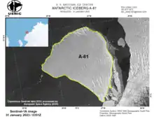 Iceberg A-81 is an iceberg that calved from the Brunt Ice Shelf in January 2023. The detachment happened near the British-operated Halley Research Station, which is located only 20 km away from the point of rupture. The iceberg is estimated to measure 1,550 square kilometres (600 sq mi).[1][2]