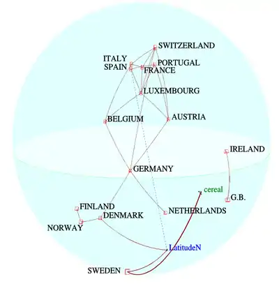 In exploratory data analysis, the iconography of correlations,[1][2] or representation of correlations, is a data visualization technique which replaces a numeric correlation matrix by its graphical projection onto a diagram, on which the “remarkable” correlations are plotted as solid lines (positive correlations) or dotted lines (negative correlations); either shorter lengths, or thicker lines, or both, represent greater correlation projection components.