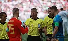 In Russia's first group match of the 2014 FIFA World Cup against South Korea, Akinfeev fumbled a long-range shot from Lee Keun-ho, dropping it over the line to give the Koreans the lead. Russia then went on to equalize, and the match finished 1–1.[26] The final group stage match between Algeria and Russia on 26 June ended 1–1, advancing Algeria and eliminating Russia. A win for Russia would have seen them qualify, and they led the game 1–0 after six minutes. In the 60th minute of the game, a green laser was shone in Akinfeev's face while he was defending from an Algerian free kick, from which Islam Slimani scored to equalise. Both Akinfeev and Russian coach Fabio Capello blamed the laser for the decisive conceded goal.[27][28]