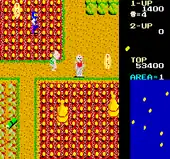 The character's movement is controlled with an 8-way joystick, and pressing the single button allows the player to attack by throwing a sickle. The direction in which the sickle is thrown cannot be determined by the player, and the weapon will automatically head towards the closest enemy. This forces an emphasis on avoiding attacks rather than attacking aggressively. The right side of the screen displays the player's points, along with a map of the level. The location of koban coins is displayed on this map, but players must circumvent walls and other barriers to go to those locations. This map is not included in the Famicom version of the game.
