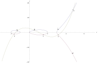 As is a polynomial of degree 6, we have that has six zeroes and hence has besides two more intersection points with , call them and , with . Now, are intersection points of with an algebraic curve. As such we know that the divisor