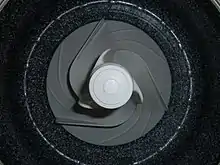 An open impeller has a hub with attached vanes and is mounted on a shaft. The vanes do not have a wall, making open impellers slightly weaker than closed or semi-closed impellers. However, as the side plate is not fixed to the inlet side of the vane, the blade stresses are significantly lower.[4] In pumps, the fluid enters the impeller's eye, where vanes add energy and direct it to the nozzle discharge. A close clearance between vanes and pump volute or back plate prevent most of fluid from flowing back. Wear on the bowl and edge of vane can be compensated by adjusting the clearance to maintain efficiency over time.[5] Because the internal parts are visible, open impellers are easier to inspect for damage and maintain than closed impellers. They can also be more easily modified to change flow properties. Open impellers operate on a narrow range of specific speed. Open impellers are usually faster and easier to maintain.  For small pumps and those dealing with suspended solids, open impellers are generally used.[6] Sand locking does not occur as easily as with closed type.