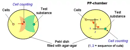 This way of evaluation deals with agar-agar or gelatine containing semi-solid layers made prior to the experiment. Small wells are cut into the layer and filled with cells and the test substance. Cells can migrate towards the chemical gradient in the semi solid layer or under the layer as well. Some variations of the technique deal also with wells and parallel channels connected by a cut at the start of the experiment (PP-technique). Radial arrangement of PP-technique (3 or more channels) provides the possibility to compare chemotactic activity of different cell populations or study preference between ligands.[1]