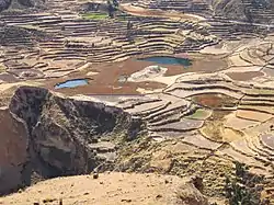Individual farmers and communities had several techniques of reducing their risk. Farmers usually had many different, scattered plots of land on which they planted a variety of crops. If one or more crops failed, others might be productive.[11] In many areas of the Andes, farmers, communities, and the Inca state constructed agricultural terraces (andenes) to increase the amount of arable land. Andenes also reduced the threat of freezes, increased exposure to sunlight, controlled erosion, and improved the absorption of water and aeration of the soil.[12] The construction and use of andenes for crops enabled agriculture in the Andes to expand into climatically marginal areas.[3] In some areas, raised beds (Waru Waru) were used for many of the same purposes as andenes and also to facilitate drainage.[13]