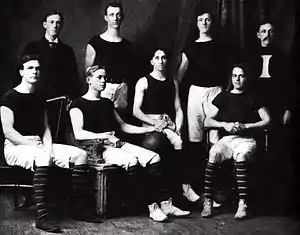 IU's first great head coach, Everett Dean, was at first a standout player who garnered IU's first All-America honors in 1921.[14] In 1924, Dean signed on as the full-time head coach of his alma mater.[14] Under Dean, the Hoosiers would elevate their play to new heights, winning their first-ever share of the Big Ten Conference title in 1926, defeating Wisconsin 35–20. The Hoosiers also won conference championships in 1928 and 1936. Four All-Americans helped lead the Hoosiers in this era: Jim Strickland, Branch McCracken (later coach), Vern Huffman, and Ken Gunning. Dean coached Indiana until 1938. He is the only coach named to both the Naismith Basketball Hall of Fame and the College Baseball Hall of Fame.[14]