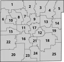 The Indianapolis City-County Council consists of 25 seats corresponding to 25 electoral districts apportioned by population throughout Marion County. Because the council is the legislative body for both the city and the county, residents of Marion County's four "excluded cities" (Beech Grove, Lawrence, Southport, and Speedway) are eligible to vote in council elections and are equally represented alongside Indianapolis residents.[13] Every seat is up for reelection every four years. The head of the council is the council president who is elected by the majority party at the council's first meeting in January.