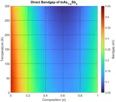 The bandgap and lattice constant of InAsSb alloys are between those of pure InAs (a = 0.606 nm, Eg = 0.35 eV) and InSb (a = 0.648 nm, Eg = 0.17 eV).[3] Over all compositions, the band gap is direct, like in InAs and InSb. The direct bandgap displays strong bowing, reaching a minimum with respect to composition at approximately x = 0.62 at room temperature and lower temperatures. The following empirical relationship has been suggested for the direct bandgap of InAsSb in eV as a function of composition (0 < x < 1) and temperature (in Kelvin):[1]