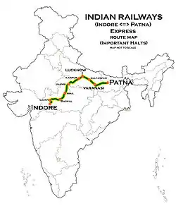 The Indore–Patna Express is an Express Train of the Indian Railways, which runs between Indore Junction railway station of Indore, the largest city and commercial hub of Central Indian state Madhya Pradesh and Patna Junction, railway station of Patna, the capital city of Bihar. As of April 2017 there are two regular trains linking Indore with Patna; they are numbered 19313 and 19321.[1] At November 2016 the train ran twice a week with one of these two services routed via Lalitpur and Sultanpur, both in Uttar Pradesh.[2]