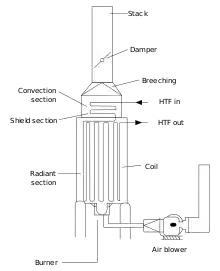 The fluid to be heated passes through the tubes and is thus heated to the desired temperature. The gases from the combustion are known as flue gas. After the flue gas leaves the firebox, most furnace designs include a convection section where more heat is recovered before venting to the atmosphere through the flue gas stack. (HTF=Heat Transfer Fluid. Industries also use their furnaces to heat a secondary fluid with special additives like anti-rust and high heat transfer efficiency. This heated fluid is then circulated round the whole plant to heat exchangers to be used wherever heat is needed instead of directly heating the product line as the product or material may be volatile or prone to cracking at the furnace temperature.)