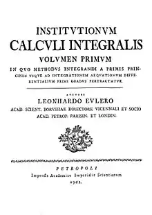 Institutiones calculi integralis (Foundations of integral calculus) is a three-volume textbook written by Leonhard Euler and published in 1768. It was on the subject of integral calculus and contained many of Euler's discoveries about differential equations.