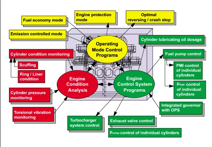 The concept of the intelligent engine revolves around the idea that the engine is thinking for itself. The brain of the system is an electronic control system that analyzes the condition of the engine and the operation of the engine’s system (The fuel injection, exhaust valve, cylinder lube oil and turbo charging system). Along with the control and timing needed to make the diesel run smoothly, the intelligent diesel goes beyond that by monitoring and evaluating the condition of the engine, based on engine conditions the smart system can actively protect the engine from damage due to overload, lack of maintenance and maladjustment.[1] The intelligent engines’ finite control gives the bridge the ability to manually adjust more variables than the current camshaft system. Along with manual controls, operators can specifically design programs that optimize fuel economy, emission, turbo output, allowing for high performance under different loads.[3]