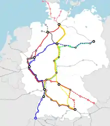 - line 2 (brown): Hannover – Bielefeld – Hamm – Dortmund – Essen – Duisburg – Düsseldorf – Cologne – Bonn – Koblenz – Mainz – Mannheim – Heidelberg – Stuttgart – Ulm – Augsburg – Munich
