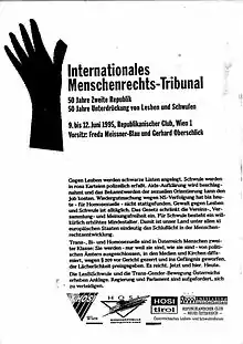- ↑ At the time of the tribunal, in 1995, two paragraphs of the Austrian penal code still threatened every public endeavour of the LGBT community. §220 penalized the "Advertising for same-sex fornication and the fornication with animals" with up to six months of prison, §221 penalized the "Forming of associations benefiting same-sex fornication" with also up to six months of prison. Therefore all participants of the tribunal could have legally been brought to court and condemned.