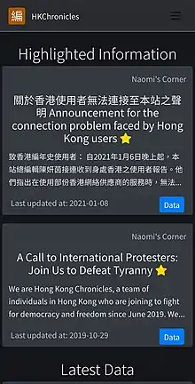 HKChronicles is a wiki-like website that details the personal information of Hong Kong police officers and pro-Beijing individuals for doxxing purposes. On 7 January 2021, the website's owner Naomi announced on the website that she had received reports from users in Hong Kong that the website was inaccessible when using certain local Internet Service Providers (ISP). Several local news reporters confirmed that the site could not be accessed within the city.[22][23] The police declined to comment on the blockage. However, in a statement, they said they "can require service providers to take restrictive actions against messages posted on digital platforms, which likely constitute the offense of endangering national security or incite a national security offense."[24] Hong Kong Broadband Network, one of the biggest mobile telecom companies in Hong Kong, said they have disabled access to the website in compliance with the requirement issued under the National Security Law on 13 January 2021.[25][26][27]