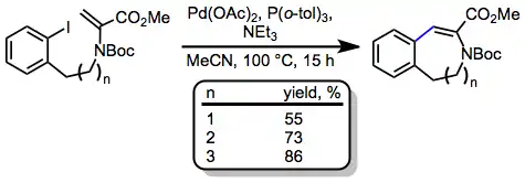 The Heck reaction is the palladium-catalyzed coupling of an aryl or alkenyl halide with an alkene to form a substituted alkene.[2] Intramolecular variants of the reaction may be used to generate cyclic products containing endo or exo double bonds. Ring sizes produced by the intramolecular Heck reaction range from four to twenty-seven atoms. Additionally, in the presence of a chiral palladium catalyst, the intramolecular Heck reaction may be used to establish tertiary or quaternary stereocenters with high enantioselectivity.[3] A number of tandem reactions, in which the intermediate alkylpalladium complex is intercepted either intra- or intermolecularly before β-hydride elimination, have also been developed.[4]