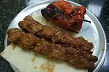 - Kebabs, a dish consisting of grilled or broiled meats on a skewer or stick.[16] The most common kebabs include lamb and beef, although others use chicken or fish.