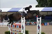 The Irish Sport Horse, or Irish Hunter, is an Irish breed of warmblood sporting horse, used mostly for dressage, eventing and show-jumping. It was bred from 1923 by cross-breeding of Irish Draught and Thoroughbred stock. There was some limited intromission of Hanoverian, Selle Français and Trakehner blood in the 1990s.[3]: 467 [4] It is a recognised true breed – foals may only be registered in the main section of the stud-book if both parents are registered in that section.[5]