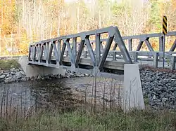 The historic bridge, in storage as of 2012,[2] was a single-span Pratt through truss built out of wrought and cast iron with elements connected by pins. The bridge was 88 feet (27 m) in length, with a roadway width of 14 feet (4.3 m) (one lane), and a portal height of 11.5 feet (3.5 m). It was set on uncoursed fieldstone abutments.[3]