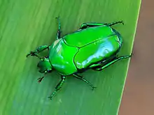 Ischiopsopha wallacei can reach a length of about 30 mm. The beetles are an electric green colour, and have the tip of the scutellum visible.