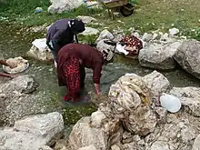Carmine dyes are obtained from resinous secretions of scale insects such as the Cochineal scale Coccus cacti, and certain Porphyrophora species (Armenian and Polish cochineal). Cochineal dye, the so-called "laq" was formerly exported from India, and later on from Mexico and the Canary Islands. Insect dyes were more frequently used in areas where Madder (Rubia tinctorum) was not grown, like west and north-west Persia.[51] Kermes is another common red dye obtained from the crushed dried bodies of a female scale insect. This dye was considered by many in the Middle East to be one of the most valuable and important dyes.[52]