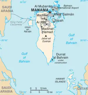 This is a list of islands of the Kingdom of Bahrain, which includes most of the archipelago known as the Bahrain Islands.[1] The Kingdom consists of 33 natural islands and a number of man-made ones.