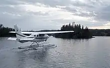 Floatplane taking off from Ozaagaateng on Washington Harbor—Beaver Island can be seen in the background at right
