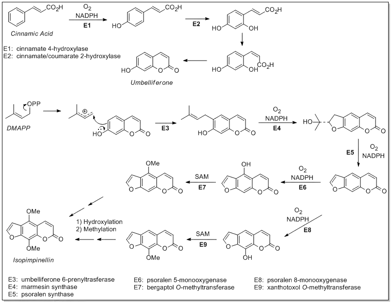 Isopimpinellin is a furanocoumarin thought to be synthesized through the mevalonate pathway via addition of dimethylallyl pyrophosphate (DMAPP) to a modified coumarate known as umbelliferone. The biosynthesis is shown below:[3]